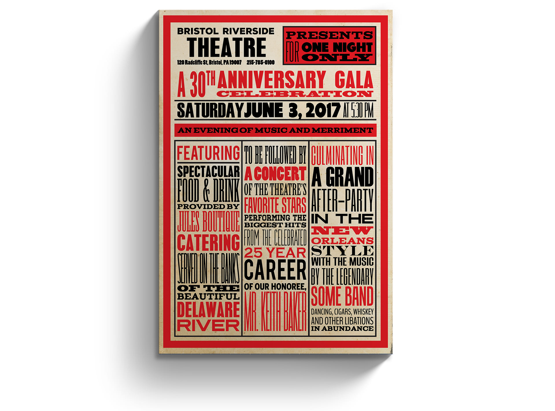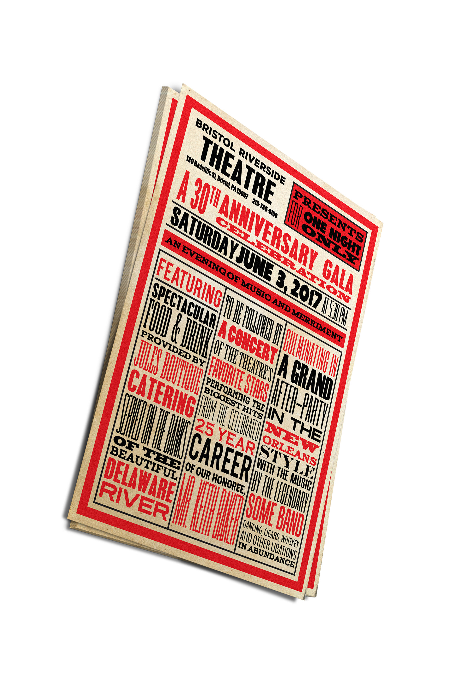 An invitation inspired by vintage playbill poster design for the theatre's 30th anniversary gala.