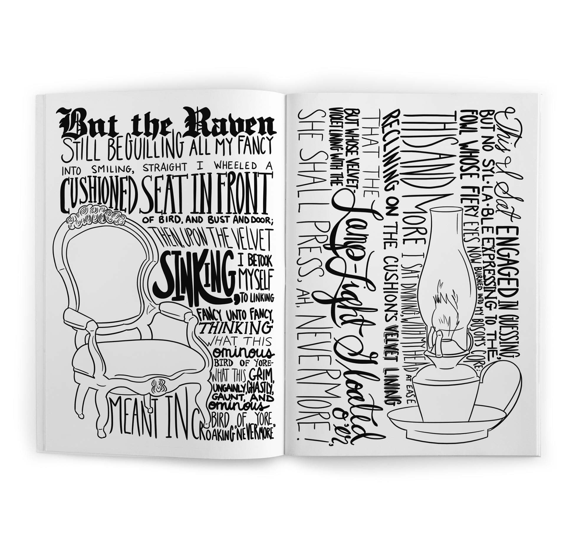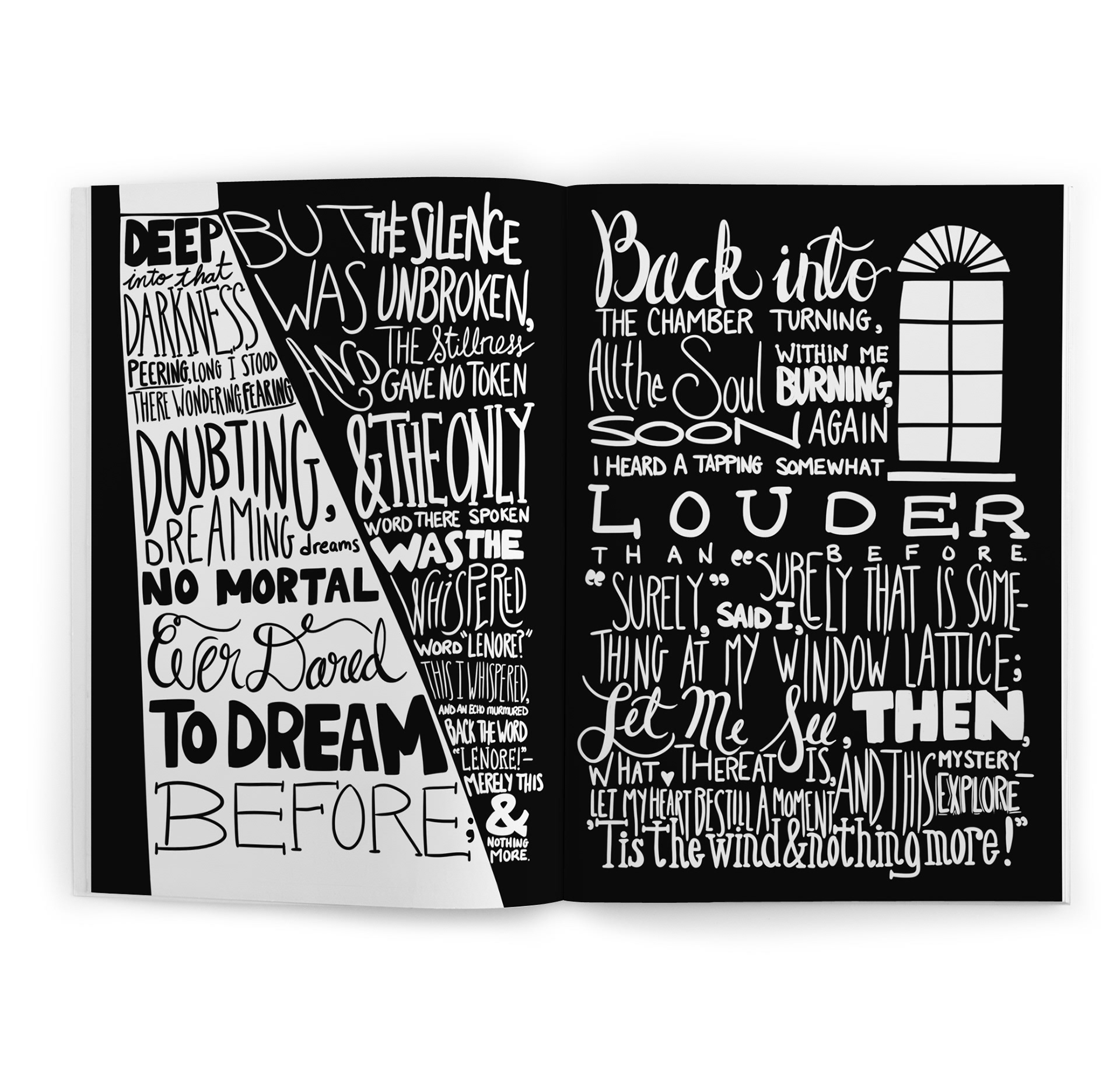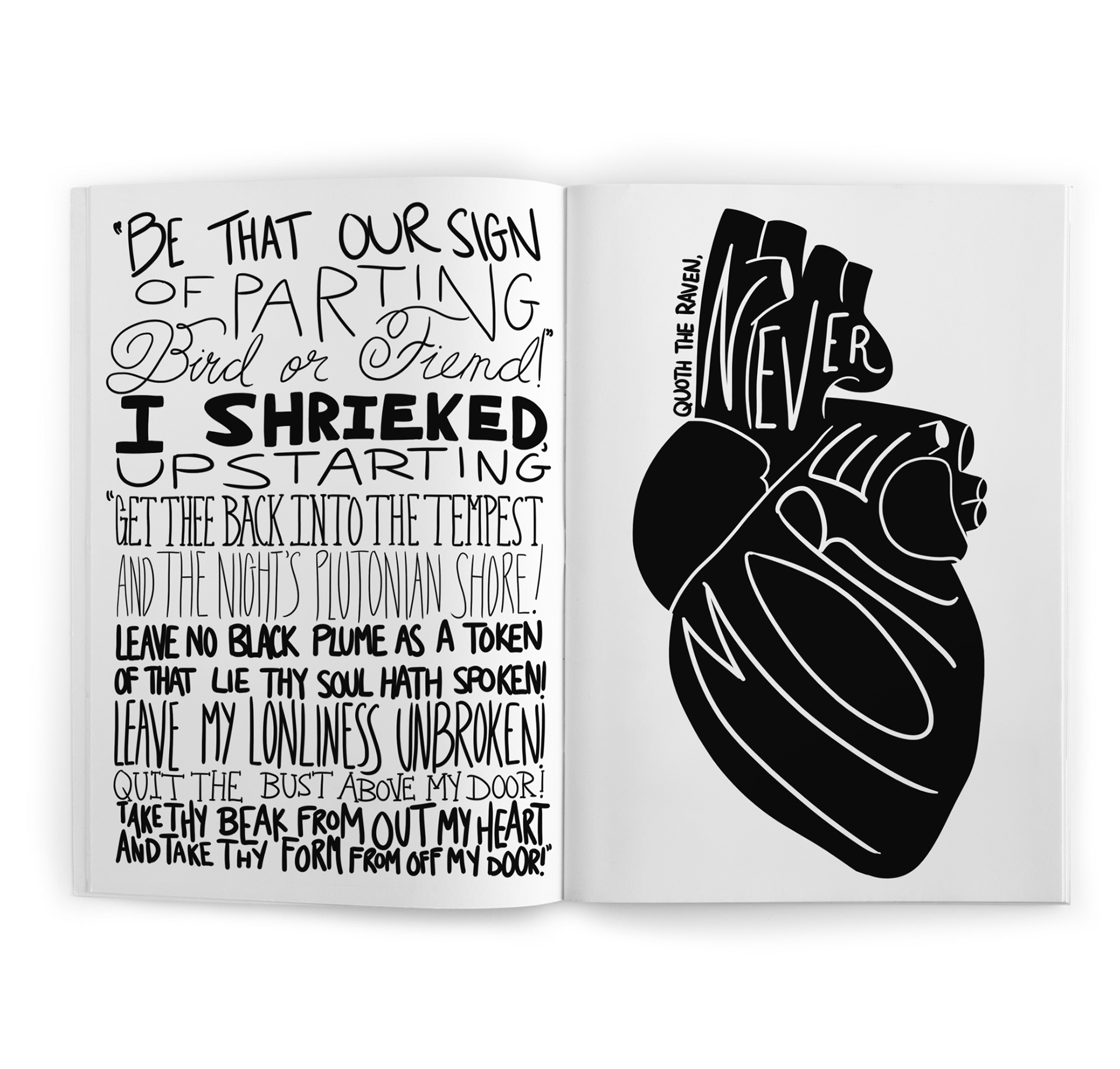 Hand-lettered "The Raven" as a black-and-white reading experience. I mapped the poem’s beats to scale, contrast, and simple icons—then built press-ready spreads where the refrain ‘Nevermore’ lands like a visual drum.